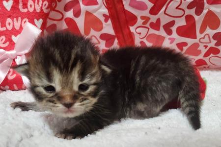 He is unmistakably a brown tabby with no white, and he has his daddy's body structure.