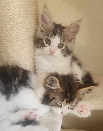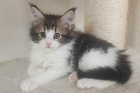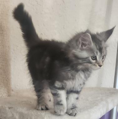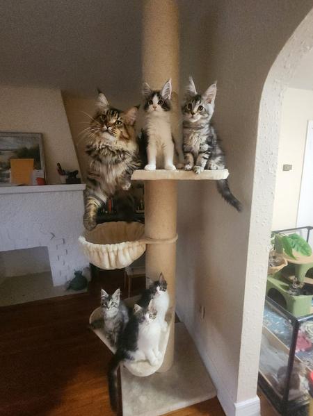 He enjoys playing with his brothers and sisters and has currently fallen in love with climbing everything-- the cat tree, the coffee table, you name it.